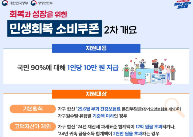 더 읽어보기Post Views: 76 행정안전부가 22일부터 소득 하위 90% 국민을 대상으로 ‘민생회복 소비쿠폰’ 2차 지급을 시작한다. 신청 기간은 이날 오전 9시부터