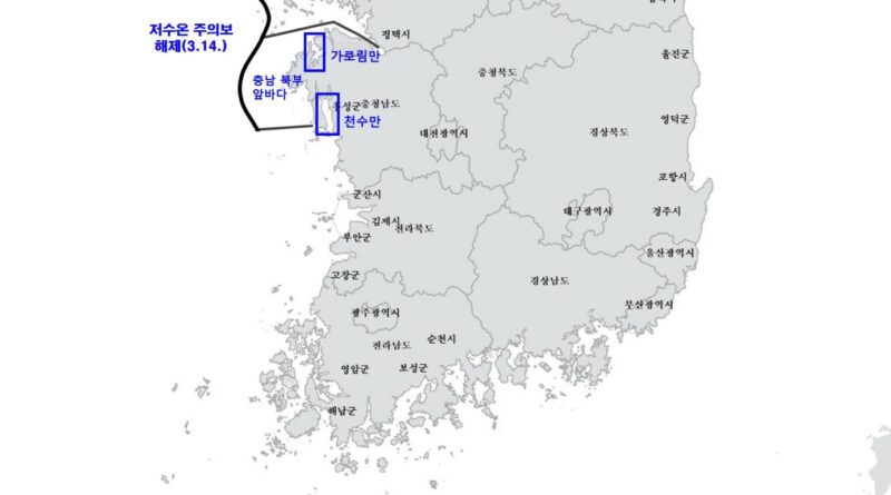 더 읽어보기Post Views: 80 해양수산부(장관 강도형)는 3월 14일(금) 14시부로 저수온 위기경보를 해제한다고 밝혔다. 국립수산과학원은 최근 기온 상승으로 수온이 점차 오르고 있으며, 향후 급격한 한파의 발생