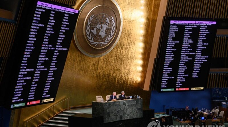(뉴욕=연합뉴스) 강건택 특파원 = 우크라이나 영토에 대한 러시아의 불법적 병합 시도를 규탄하는 결의가 유엔총회에서 압도적인 지지로 채택됐다.