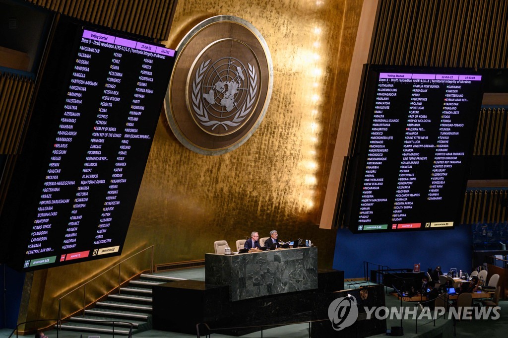 유럽연합(EU) 주도로 마련된 이 결의안은 러시아가 도네츠크, 루한스크, 자포리자, 헤르손 등 우크라이나의 4개 지역에서 실시한 주민투표를 국제법상 효력이 없는 불법행위로 규정하고, 병합 선언도 인정하지 않는다는 내용을 담았다.