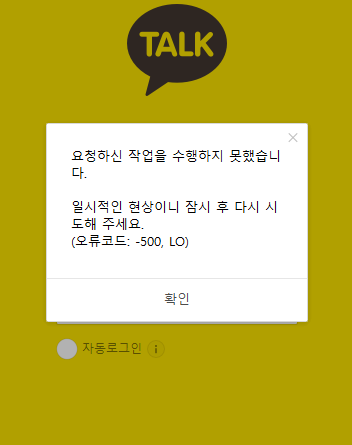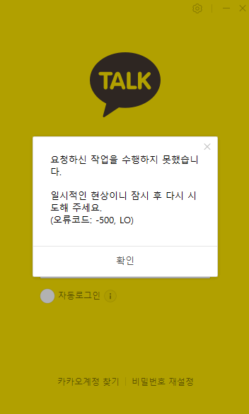 금일 오후 1시 30분가량 피사카톡(PC)과 모바일 카톡 모두 오류가 발생됐다. 피시카톡 로그인 시도시 ‘요청하신 작업을 수행하지 못했습니다. 일시적인 현상이니 잠시후 다시 시도해 주세요 (오류코드 : -500,LO)’라는 문구와 함께 로그인할 수 없다.