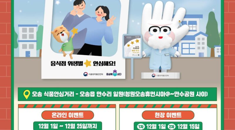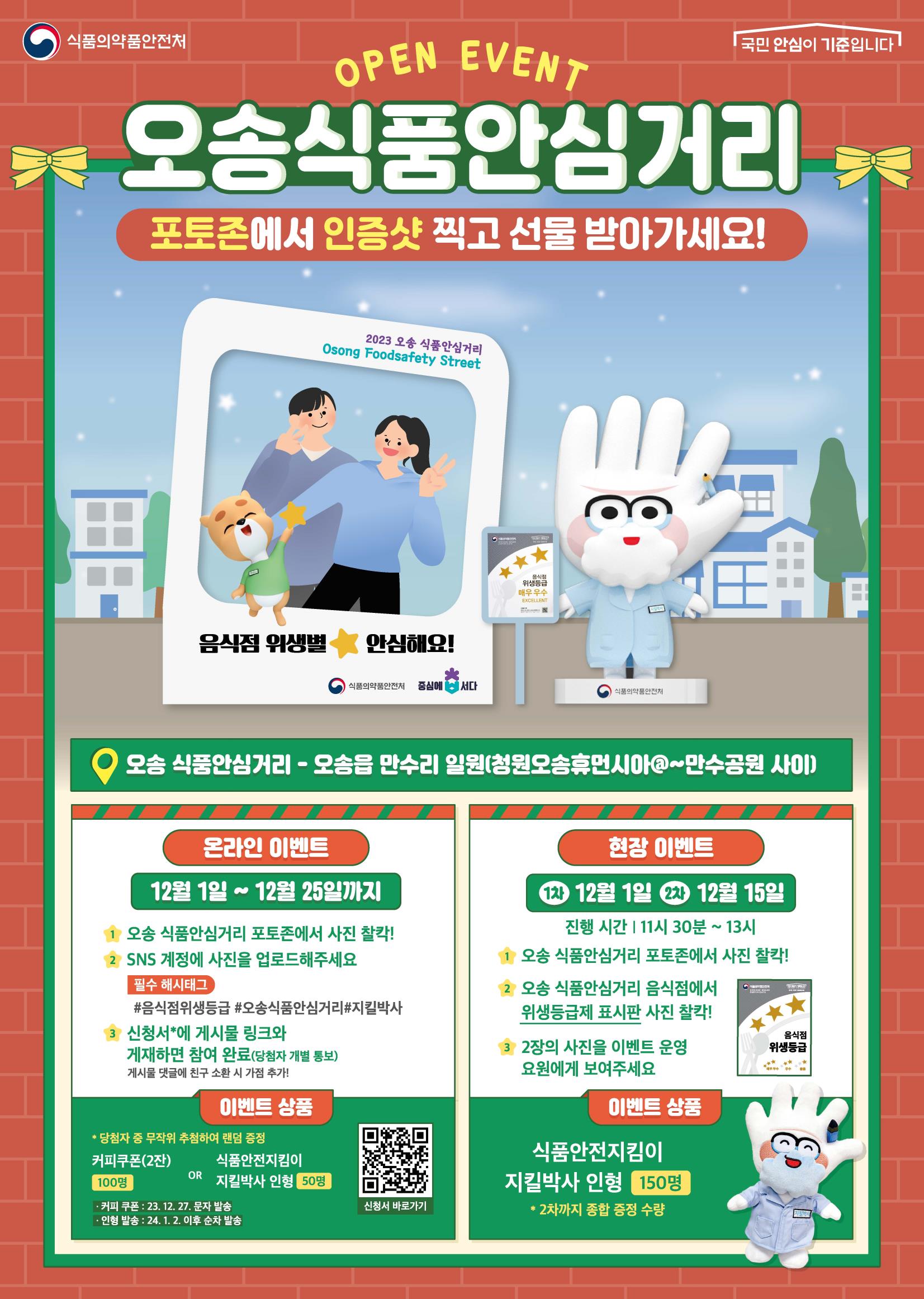 한편, ‘오송 식품안심거리’ 지정을 기념하기 위해 식중독 예방 캐릭터인 지킬박사와 포토존 조형물을 설치했으며, 포토존 방문 인증샷을 개인 누리소통망에 게시하면 추첨으로 선정하여 소정의 선물을 증정하는 이벤트를 12월 25일까지 진행할 예정이다.