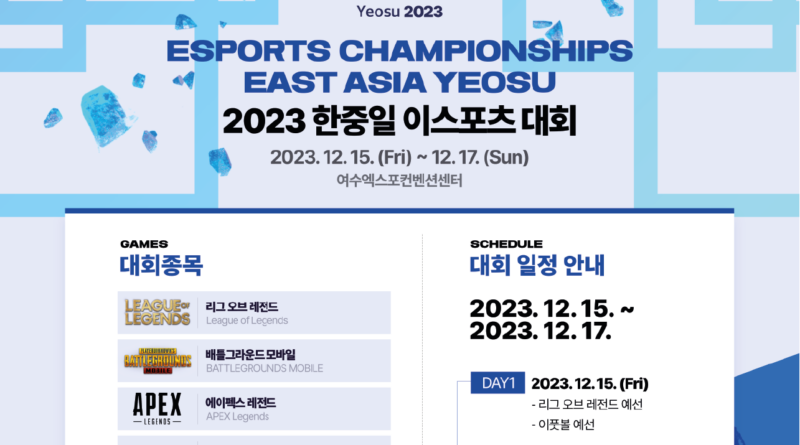 2023 한·중·일 이스포츠 대회(Esports Championships East Asia 2023)가 오는 15일 개막식을 갖는다.