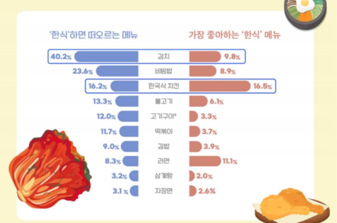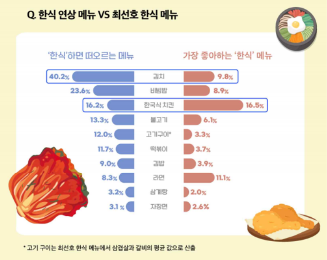 최근 1년간 자주 먹은 한식은 한국식 치킨(29.4%, 중복응답), 김치(28.6%), 라면(26.9%) 순이었고, 가장 선호하는 한식은 한국식 치킨(16.5%), 라면(11.1%), 김치(9.8%) 순이었다.