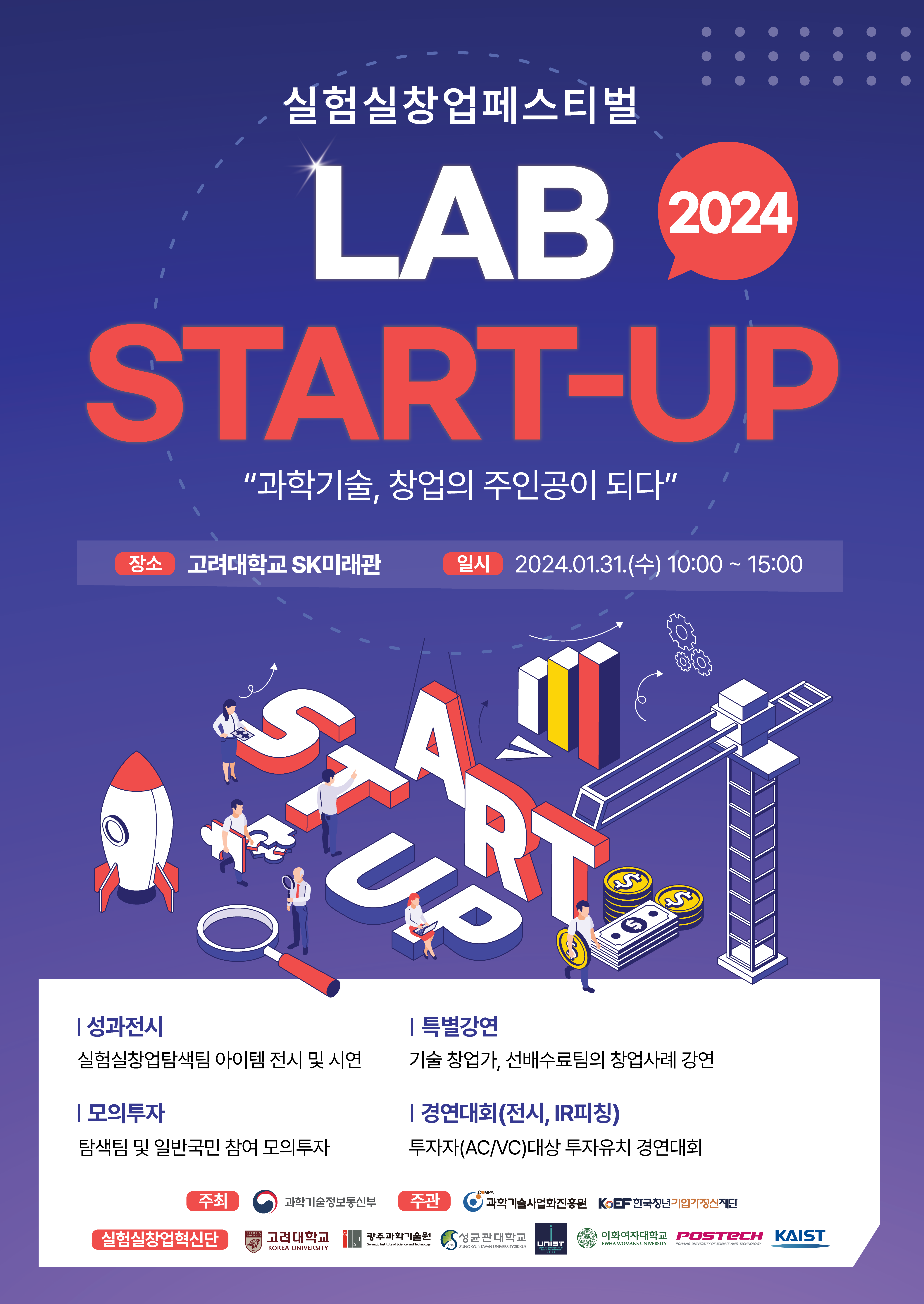 과학기술정보통신부는 1월 31일(수) 고려대학교 SK미래관에서 ‘실험실창업 페스티벌「LAB Start-Up 2024」’(이하 ‘실험실창업 페스티벌’)를 개최하였다.