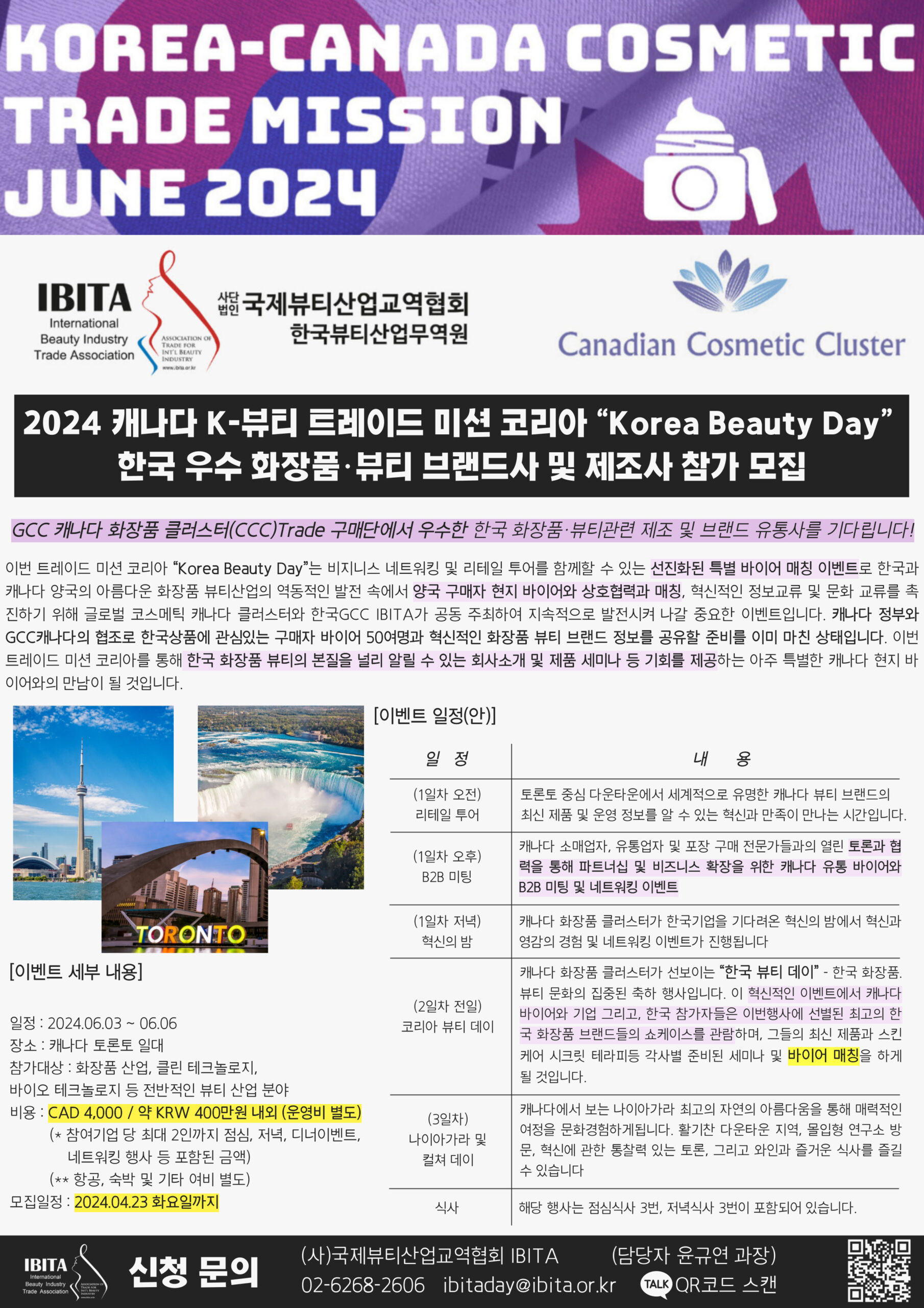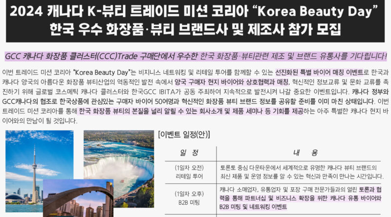 6월 3일~ 6일 캐나다 토론토에서 진행되는 “2024 캐나다 미션코리아”는 캐나다 클러스터와의 한국 대표부 협력 계약 후속 조치로 양국 간의 수출상담회, 컨퍼런스, 네트워킹을 위해 판매자와 구매자간 직접 매칭하고, 이에 캐나다 코스메틱 클러스터(CCC)는 우리 한국 사절단을 크게 환영할 준비를 마쳤다고 전했다.