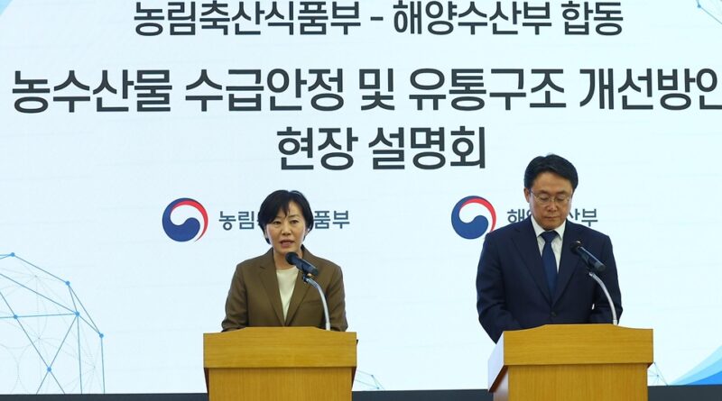 송미령 농림축산식품부 장관이 13일 서울 서초구 aT센터 농산물 온라인도매시장에서 열린 ‘농수산물 수급안정 및 유통구조 개선방안 현장 설명회’에서 강도형 해양수산부 장관과 합동 발표를 하고 있다.