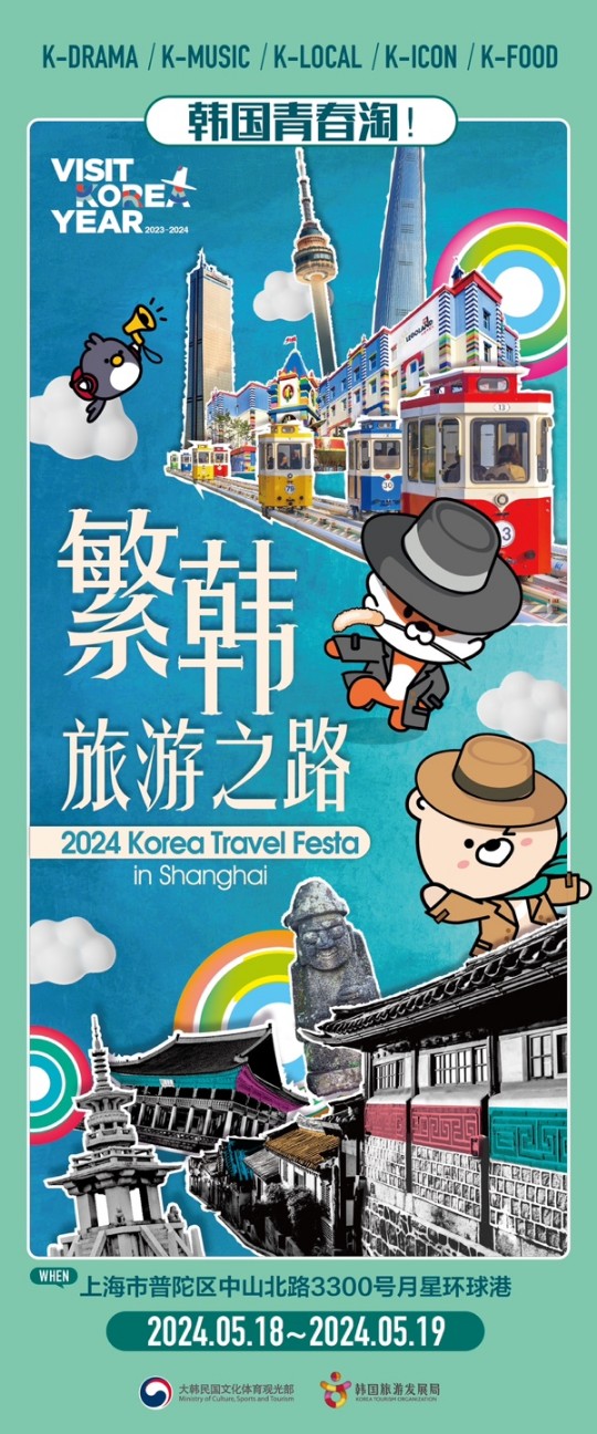5월 18일(토)과 19일(일)에는 상하이 환치유강 쇼핑몰에서 중국 소비자를 대상으로 대규모 케이-관광 마케팅 행사를 개최한다. 2030 세대 외에도 다양한 연령대별로 즐길 수 있는 맞춤형 케이-관광 콘텐츠를 구성해 최신 유행의 지역 관광지와 새로운 관광상품을 홍보한다. ▴1990년대부터 2020년대까지 인기 한류드라마와 음악을 소재로 한국 추억여행의 향수를 자극하는 ‘케이 청춘’, ▴강릉 커피, 바다부채길, 전주비빔밥, 한옥마을, 부산 해운대블루라인파크 등 8개 지역의 대표 여행지와 보령머드축제, 대구치맥페스티벌 등 인기 축제를 소개하는 ‘케이 로컬’, ▴한국의 슈퍼를 주제로 롯데칠성, 풀무원 등과 협업해 한국 복고풍(레트로) 식품을 전시하고 한국농수산물유통공사의 국가대표 33선 음식을 홍보하는 ‘케이-슈퍼마켓’을 만나볼 수 있다. ▴‘케이 아이콘’에서는 중국 현지에서 인기가 높은 캐릭터인 ‘루피’와 한국관광공사·지자체의 캐릭터 등과 함께 한국 여행을 떠난 것처럼 사진을 찍을 수 있다.