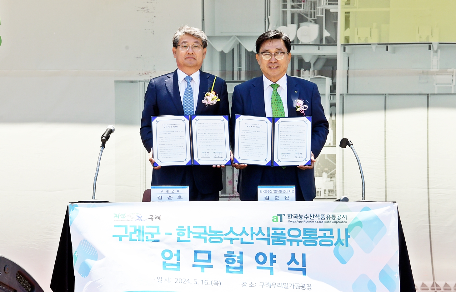 한국농수산식품유통공사(사장 김춘진)와 구례군(군수 김순호)은 16일 구례군에서 K-푸드 수출 확대와 저탄소 식생활 확산을 위한 업무협약을 체결했다.