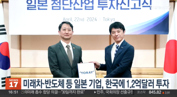 탄소섬유 분야 세계 1위인 도레이 사(社)는 1965년 한일 국교 수교 이전인 1963년부터 섬유 분야에 처음 진출한 이래 투자를 지속적으로 확대하여 60년간 누적 투자금액이 5조 원에 이르고 4천여 명의 고용 창출에 기여한 대표적인 외국인 투자 모범 사례이다. 지난 4월에 안 장관 방일 기간 중 도레이 사(社)가 아라미드섬유 제조시설 투자를 확정하고 투자신고서를 제출한 데 이어, 한 달 만에 도레이 사(社)와 대규모 추가투자 계획에 대한 투자협력 양해각서를 체결하는 진전을 이루었다.