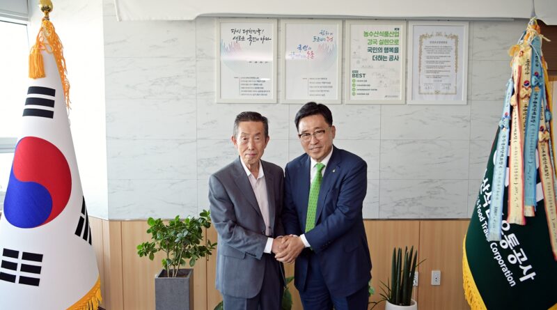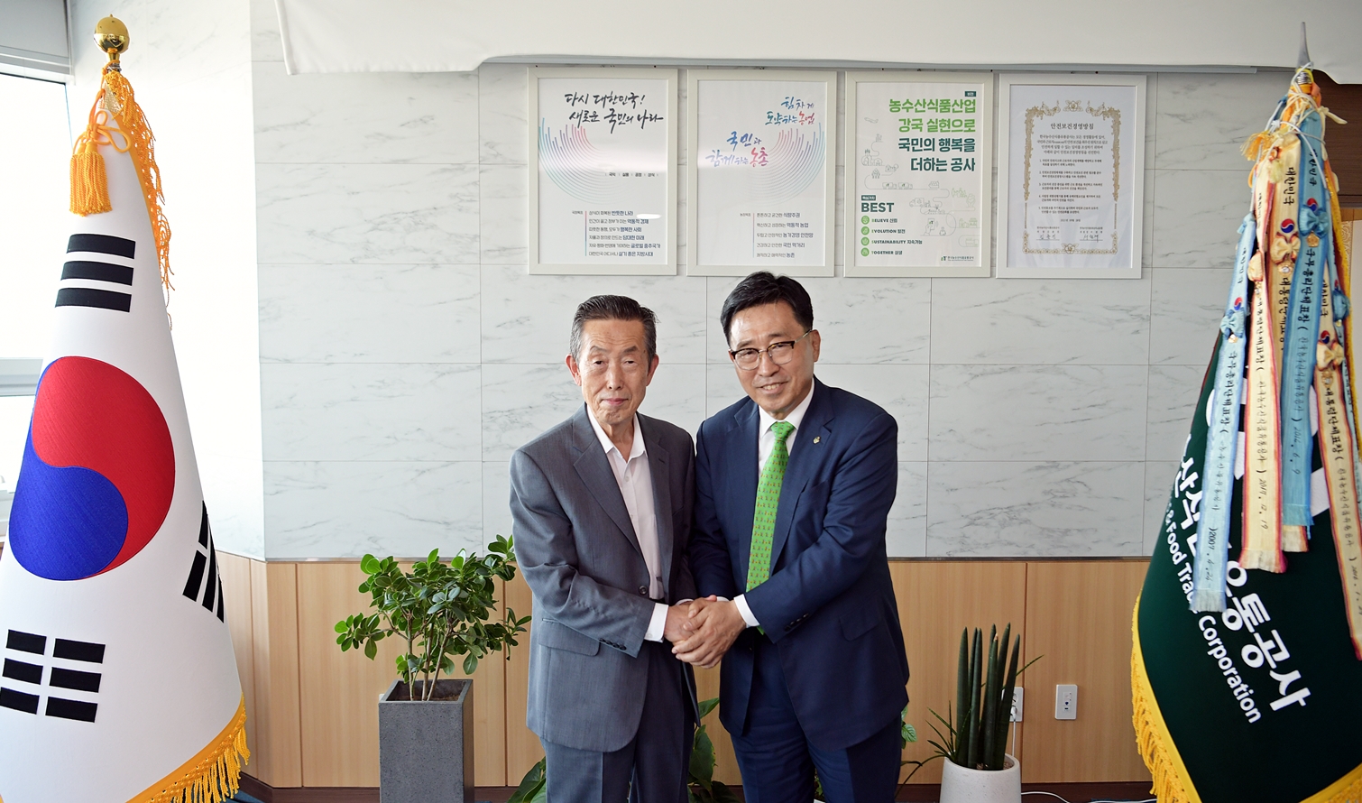 한국농수산식품유통공사 김춘진 사장은 20일 나주 본사에서 사단법인 한국유권자중앙회 강수완 총재를 만나 기후 위기 시대에 지구를 지키기 위한 대국민 기후 행동 독려방안을 모색했다.