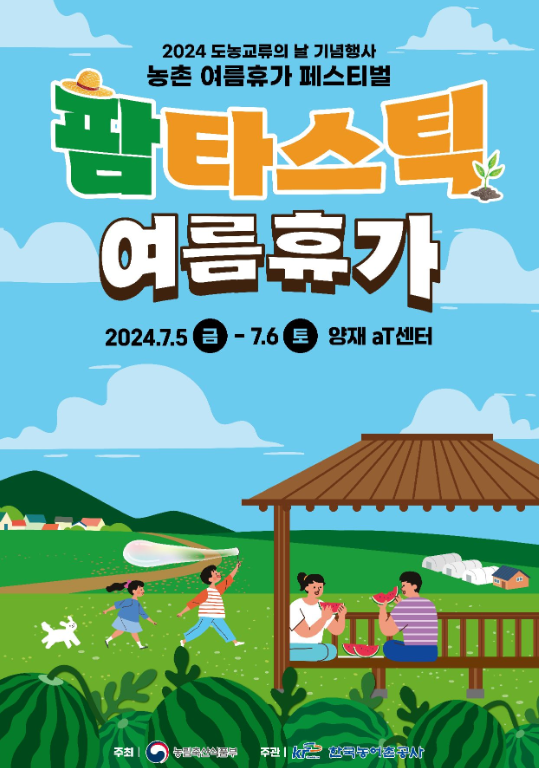 농림축산식품부(장관 송미령)는 7월 5일부터 6일까지 2일간 서울 양재동 에이티(aT)센터에서 「2024 도농교류의 날 기념행사 및 농촌 여름휴가 축제(페스티벌)」을 개최했다.