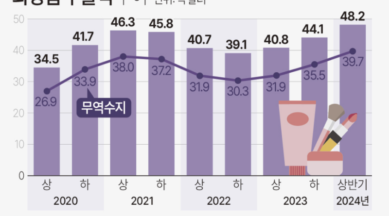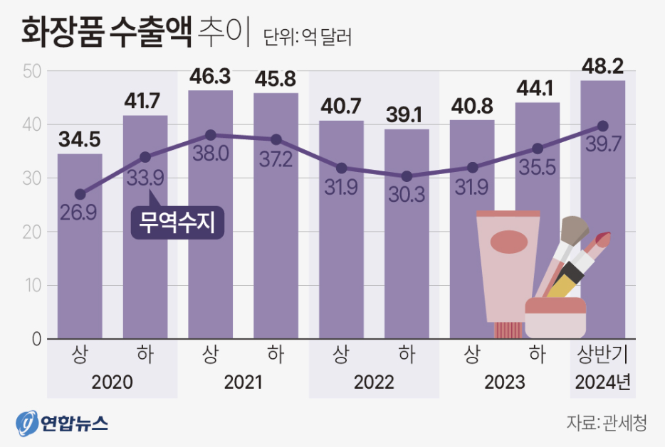관세청의 무역통계에 따르면, 상반기 동안 화장품 수출액은 작년 동기 대비 18.1% 증가한 48억 2천만 달러(약 6조 7천억 원)로, 반기 기준으로는 사상 최대를 기록했다.