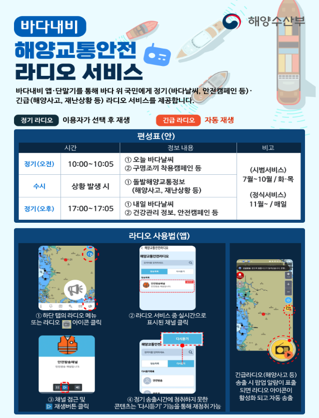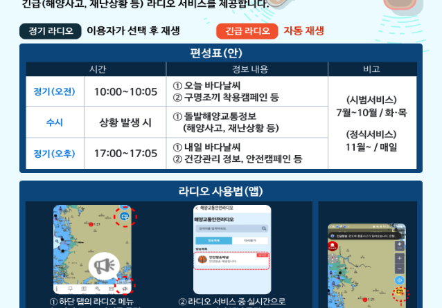 해양교통안전 라디오 서비스는 스마트폰에 바다내비 앱을 설치하면 누구나 이용할 수 있으며, 바다내비 단말기가 설치된 선박에서는 9월부터 단말기를 통해 서비스를 청취할 수 있다. 10월까지는 테스트 운영 기간으로, 매주 화요일과 목요일에 주 2회 서비스가 제공된다. 11월부터는 정식 서비스가 시작되어 매일 서비스를 이용할 수 있으며, 실시간 방송을 놓친 경우 다시 듣기 기능을 통해 반복 청취가 가능하다.