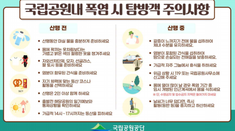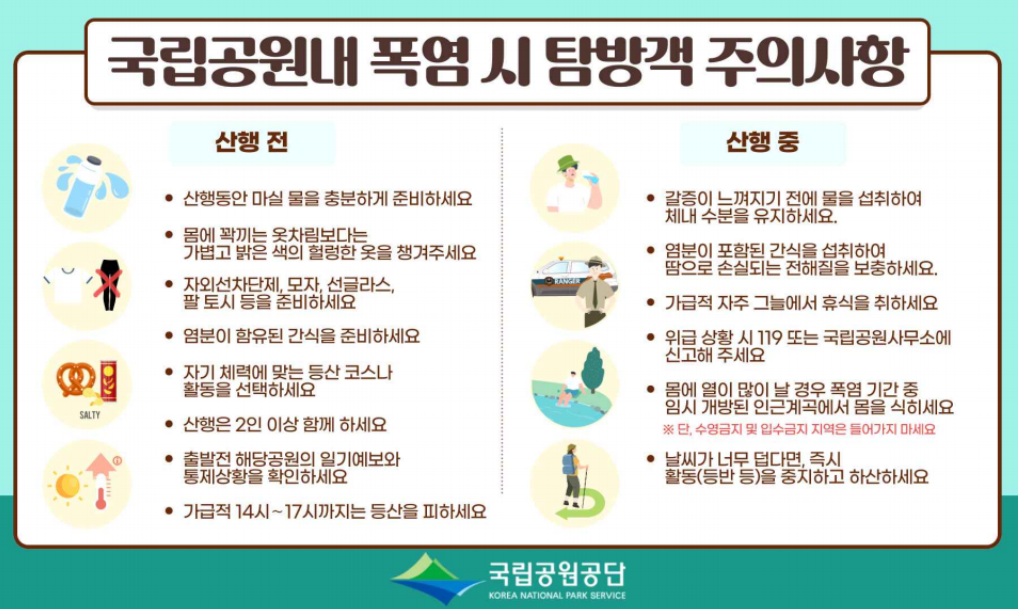 환경부 산하의 국립공원공단(이사장 송형근)은 여름 휴가철에 맞춰 국립공원 방문객들이 폭염에 의한 온열질환이 발생하지 않도록 안내하고 있다.