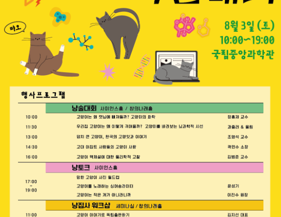이번 ‘냥냥이 학술대회’는 8월 8일 세계 고양이 날을 기념하여 과학관에서 처음으로 열리는 행사이다. 이 행사에서는 고양이를 과학적으로 탐구하는 강연과 다양한 프로그램이 진행되며, 고양이를 좋아하는 누구나 사전 예약 없이 무료로 참여할 수 있다. 단, 「고양이 소묘(드로잉) 연수회(워크숍)」와 「반려동물 음식 영양학 및 고양이 케이크 만들기」는 유료로 진행되며, 일부 연수회와 사진대회 출품은 현재 마감된 상태이다.