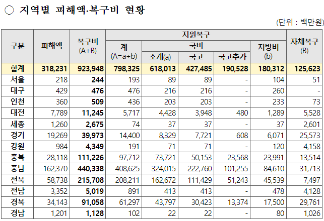 중앙재난안전대책본부는 피해 집계에 따라 복구비 지원 규정에 의거하여 복구비를 산정했다.