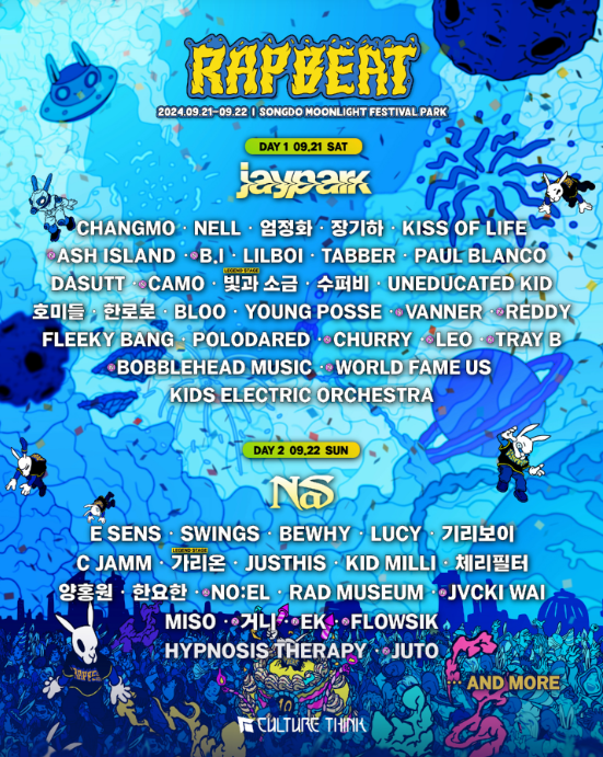 ‘랩비트 2024(RAPBEAT 2024)’: 9월 21일(토)~22일(일) 동안 인천 송도달빛축제공원에서 열리며, 힙합, 록, 케이팝 등 다양한 장르의 뮤직 페스티벌로, 박재범, 나스(Nas), 엄정화, 장기하 등 35개 팀이 출연할 예정이다.