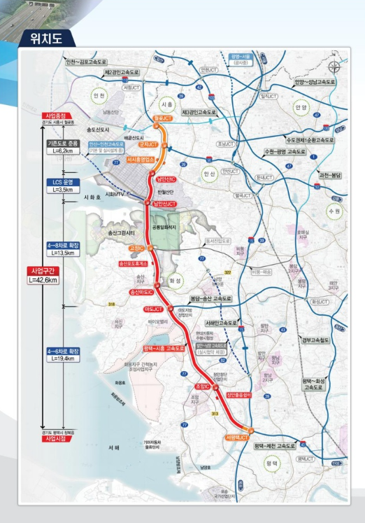 이 사업은 현재 운영 중인 평택-시흥 고속도로 총연장 42.6㎞ 중 36.4㎞ 구간을 기존 왕복 4차로에서 왕복 6~8차로로 확장하는 사업이다.