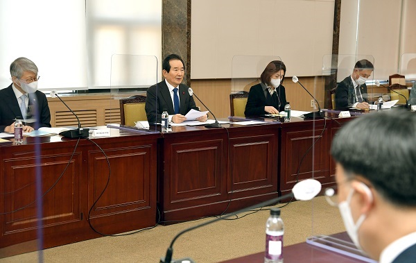 정세균 국무총리가 17일 정부서울청사에서 열린 국가산학연 협력위원회를 주재하고 있다.