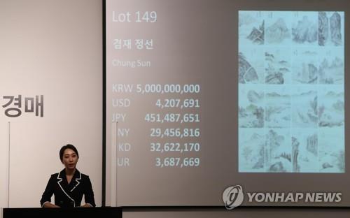 서울 강남구 케이옥션에서 열린 7월 경매에 출품된 국가지정 문화재 보물 제1796호 ‘정선필 해악팔경 및 송유팔현도 화첩’이 시작가 50억 원에 경매에 부쳐졌지만 유찰됐다.