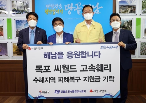 (목포=연합뉴스) 조근영 기자 = 국내 제주기점 항로 1위 연안여객선사 씨월드고속훼리㈜(회장 이혁영)는 14일 해남과 진도군에 수재 구호 성금 2천만원을 전달했다.